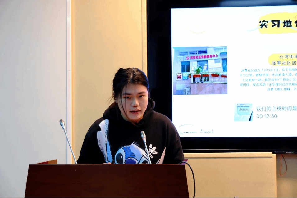 吕文同学在龙腾街道办事处实践。她用原创诗歌概括自己从适应工作到胜任工作的不凡经历,她切实参与居民信息管理,撰写文稿、策划活动,在向下扎根的同时向上生长。