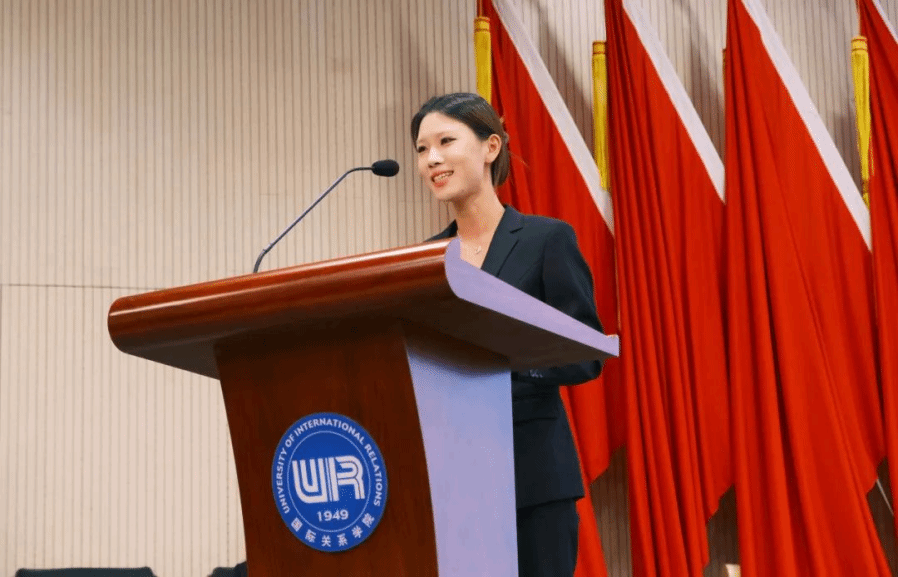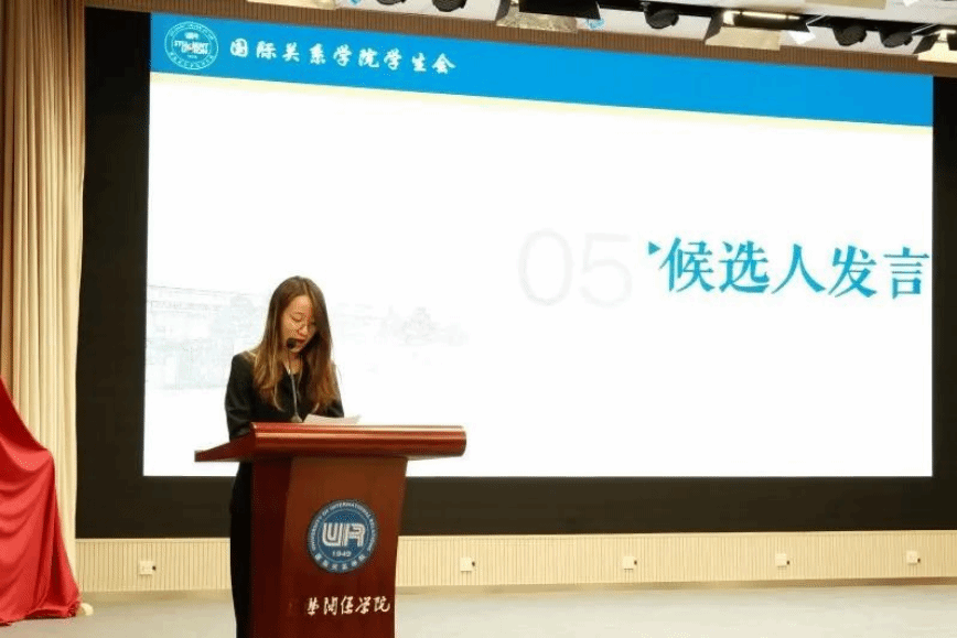 国际关系学院院团委段雅婕老师上台致辞。段雅婕老师指出,国际关系学院学生会功能型团支部自成立起,始终担负着联系青年、引导青年、服务青年、凝聚青年的重要职责。她对过去一年中国际关系学院学生会功能型团支部的工作给予了高度肯定,并对新一届学生会功能型团支部委员会成员提出了三点期望:第一,强调责任意识,服务广大同学;第二,要勇于创新实践,探索支部工作新路径;第三,要传承优良传统,展现国关学子风采。