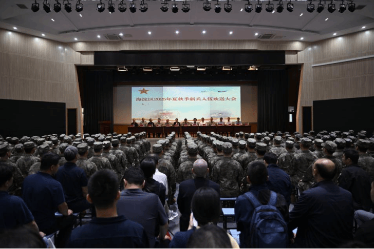 欢送大会在雄壮激昂的国歌声中拉开帷幕。海淀区人民政府、区人武部等相关部门领导出席大会并发表重要讲话,对全体新兵投身国防、报效祖国的赤子情怀给予了高度赞扬和热烈欢迎。大会隆重而又热烈,全体新兵高唱中国人民解放军军歌,歌声嘹亮,展现了新兵战士们建功军营、为国奉献的豪情壮志。